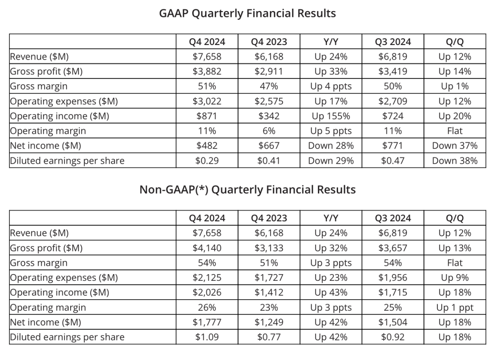 当地时间2月4日美股盘后,AMD公布了截至2024年12月31日的2024年第四季度业绩,报告期间公司营收达到76.58亿美元,同比增长24%,高于市场预期的75.3亿美元;美国通用会计准则下(GAAP)净利润为4.82亿美元,上年同期为6.67亿美元,同比下降28%;非美国通用会计准则下(Non-GAAP)净利润同比增长42%至17.77亿美元,摊薄后每股收益同比增长42%至1.09美元,略高于市场预期的1.08美元。
